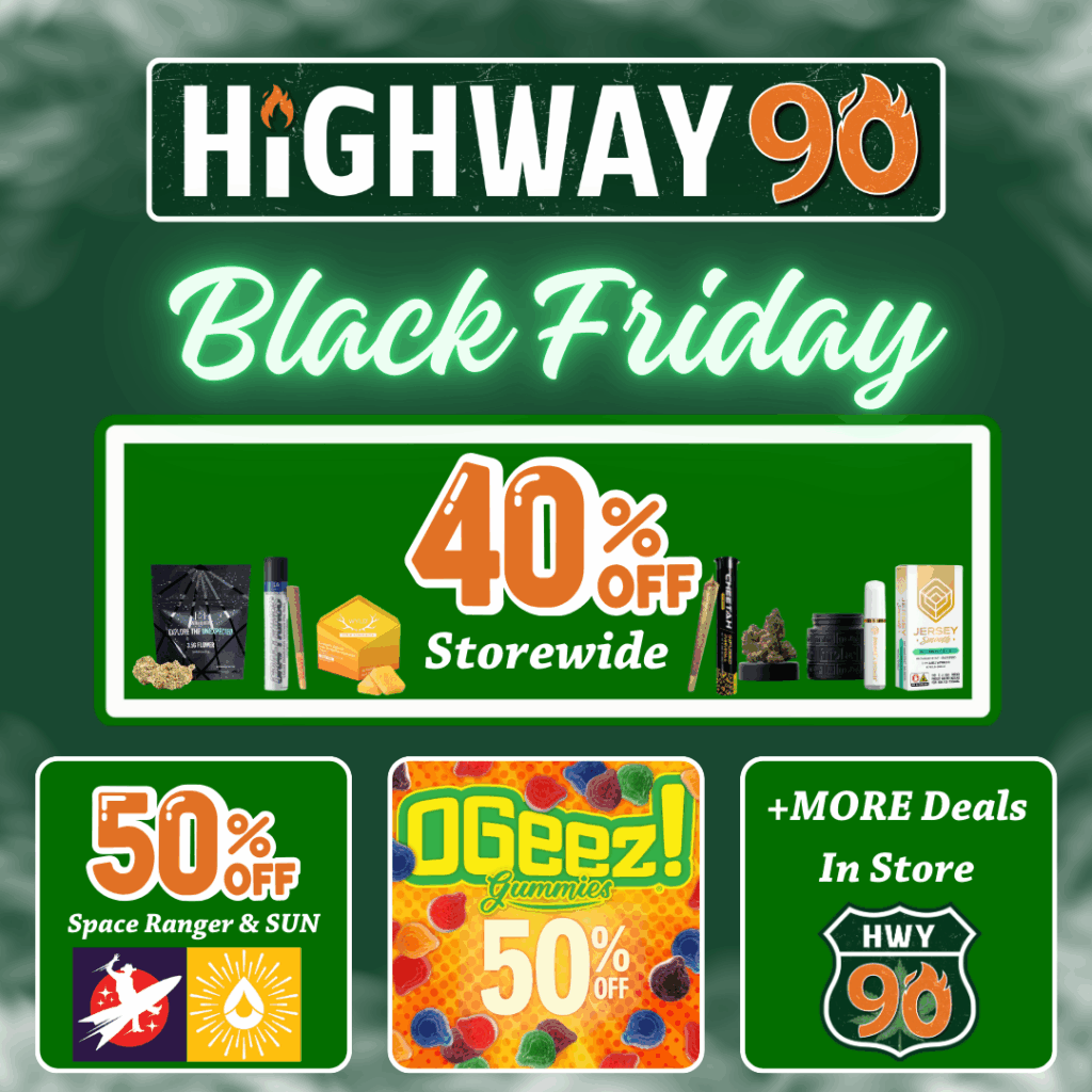 🛣️11/28 Deals:    🖤Happy Black Friday!      ✨40% Off Storewide✨         🍬50% Off OGeez!🍬         ☀️50% Off Sun Extracts☀️          🚀50% Off Space Ranger🚀         Featured Brands:    🍃40% Off Miss Grass🍃          🚜40% Off The Farmers Market🚜         💐40% Off Ozone💐         🌿 40% Off Simply Herb🌿          ⚡40% Off High Wired⚡         🍎40% Off Effin🍎        👕25% Off Highway 90 Merch👕        🌊Buy The Clear, Get A Twax Pre-Roll For A Penny🌊