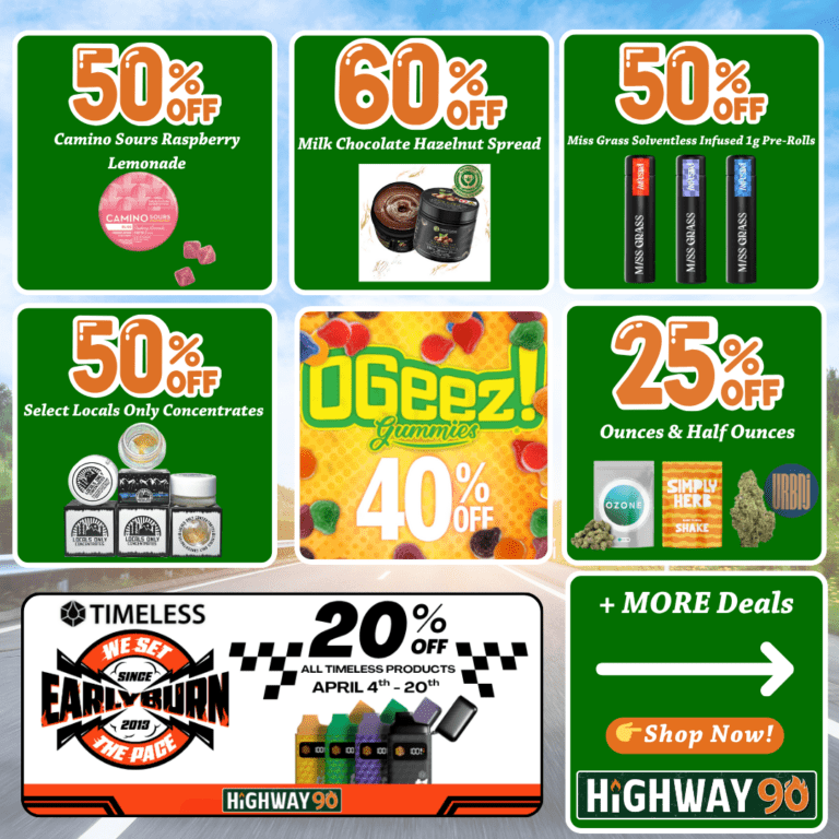 🛣️NEW: THC Drinks Are Here!🥤                    🔥50% Off Miss Grass Solventless Infused 1g Pre-Rolls 🔥                🍋50% Off Camino Sours Raspberry Lemonade🍋                 🍫60% Off Milk Chocolate Hazelnut Spread🍫            ✨50% Off High Wired Biscotti Infused 1g Pre-Roll✨            💎20% Off Timeless & Noir💎                🍃25% Off Half Ounces & Ounces🍃                  🍓40% Off OGeez!🍓      ⭐$27 Jersey Smooth Kief Infused Pre-Rolls⭐              🛣️35% Off At Your 1st Visit           🛣️20% Off At Your 2nd Visit          🛣️25% Off At Your 3rd Visit          📲Update Your Highway 90 App For The Latest Version!
