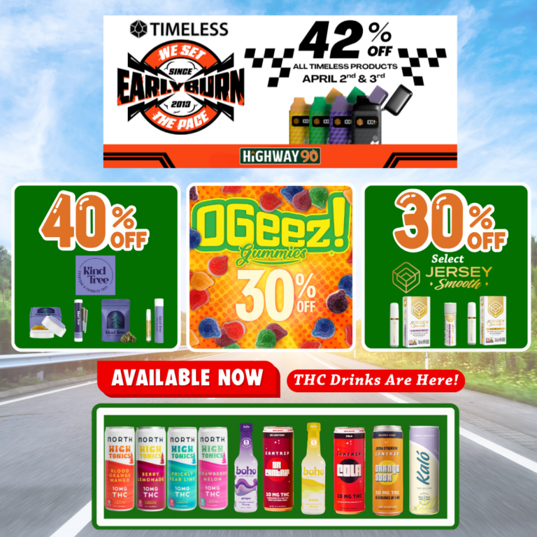 🛣️NEW: THC Drinks Are Here!        🥤4 For $20 10mg or 4 For $35 50mg Drinks🥤                    🔥42% Off Timeless & Noir Through 4/3!🔥              🍑50% Off Avexia Peach Ginger Tincture🍑             💜40% Off Kind Tree💜                  🍬30% Off OGeez!🍬        🍃25% Off Half Ounces & Ounces🍃             🛣️35% Off At Your 1st Visit           🛣️20% Off At Your 2nd Visit          🛣️25% Off At Your 3rd Visit          📲Update Your Highway 90 App For The Latest Version!             🚨Our Debit readers are temporarily unavailable. In the meantime, please use cash, our on-site ATM, or Dutchie Pay.🚨