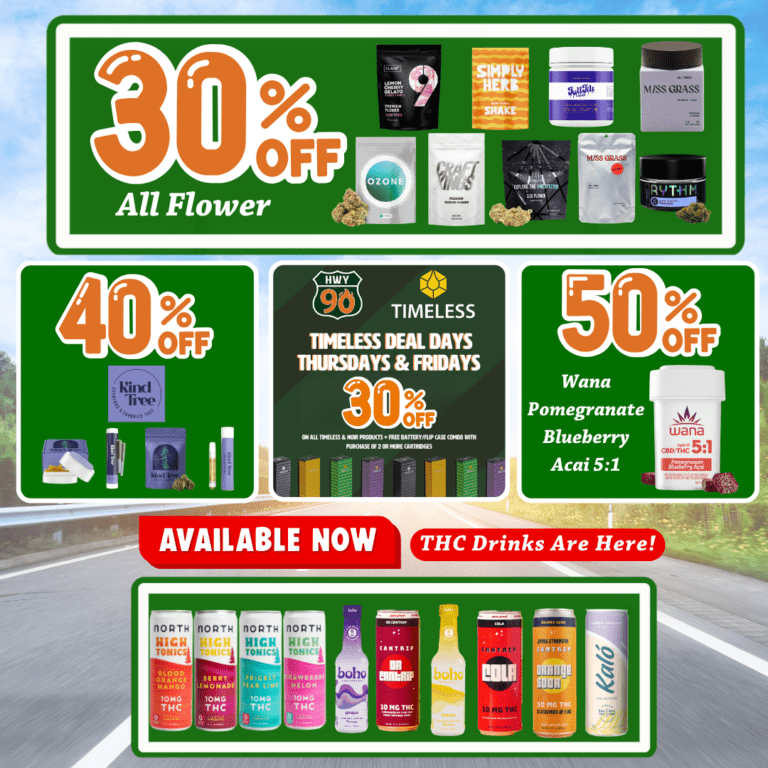 🔥30% Off All Flower!🔥            🫐50% Off Wana Pomegranate Blueberry Açaí 5:1🫐                  💜40% Off Kind Tree💜            💎30% Off Timeless & Noir On Thursdays & Fridays💎                   🍬25% Off Wyld🍬                  🍃25% Off Half Ounces & Ounces🍃             🛣️35% Off At Your 1st Visit           🛣️20% Off At Your 2nd Visit          🛣️25% Off At Your 3rd Visit          📲Update Your Highway 90 App For The Latest Version!             🚨Our Debit readers are temporarily unavailable. In the meantime, please use cash, our on-site ATM, or Dutchie Pay.🚨