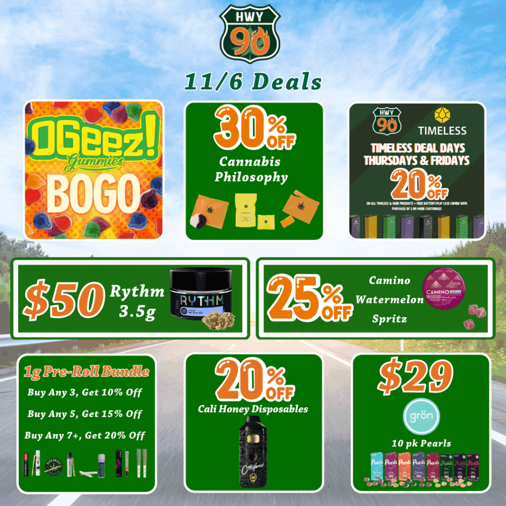 🛣️11/6 Deals:         💎20% Off Timeless & Noir On Thursdays & Fridays💎           🪄30% Off Cannabis Philosophy🪄           🍉25% Off Watermelon Spritz Camino🍉        🍃1g Pre-Roll Bundle: Buy 3, Get 10% Off, Buy 5, Get 15% Off, Buy 7+, Get 20% Off🍃        ❄️$65 Snowball Live Resin Disposable❄️          ⭐$50 Rythm 3.5g⭐            🍯20% Off Cali Honey 2g Disposables🍯
