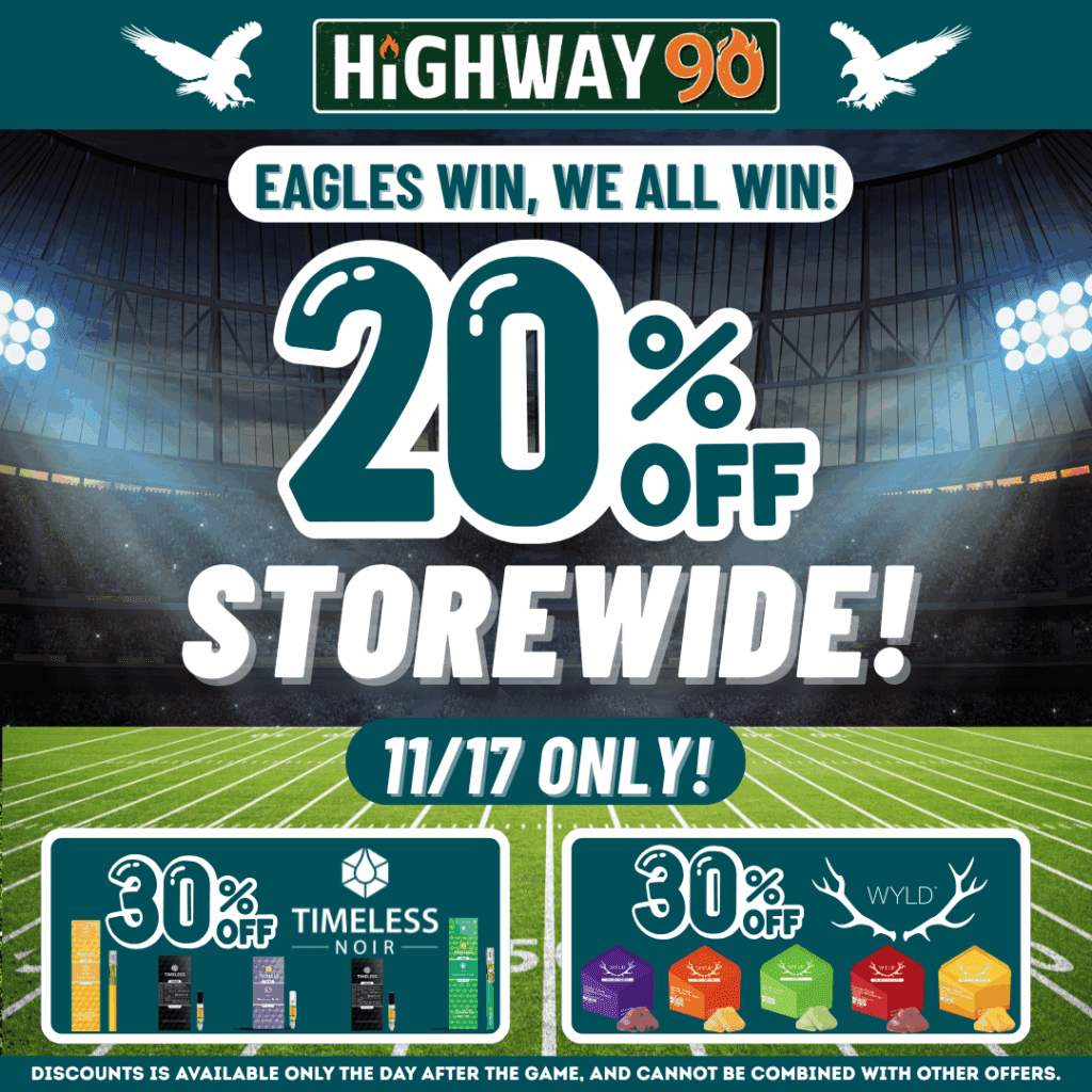 🛣️11/17 Deals: 🏈Eagles Win! 20% Off Storewide! 🏈 🍬30% Off Wyld🍬 💎30% Off Timeless & Noir💎 🌼25% Off Elderflower 1g Cart🌼