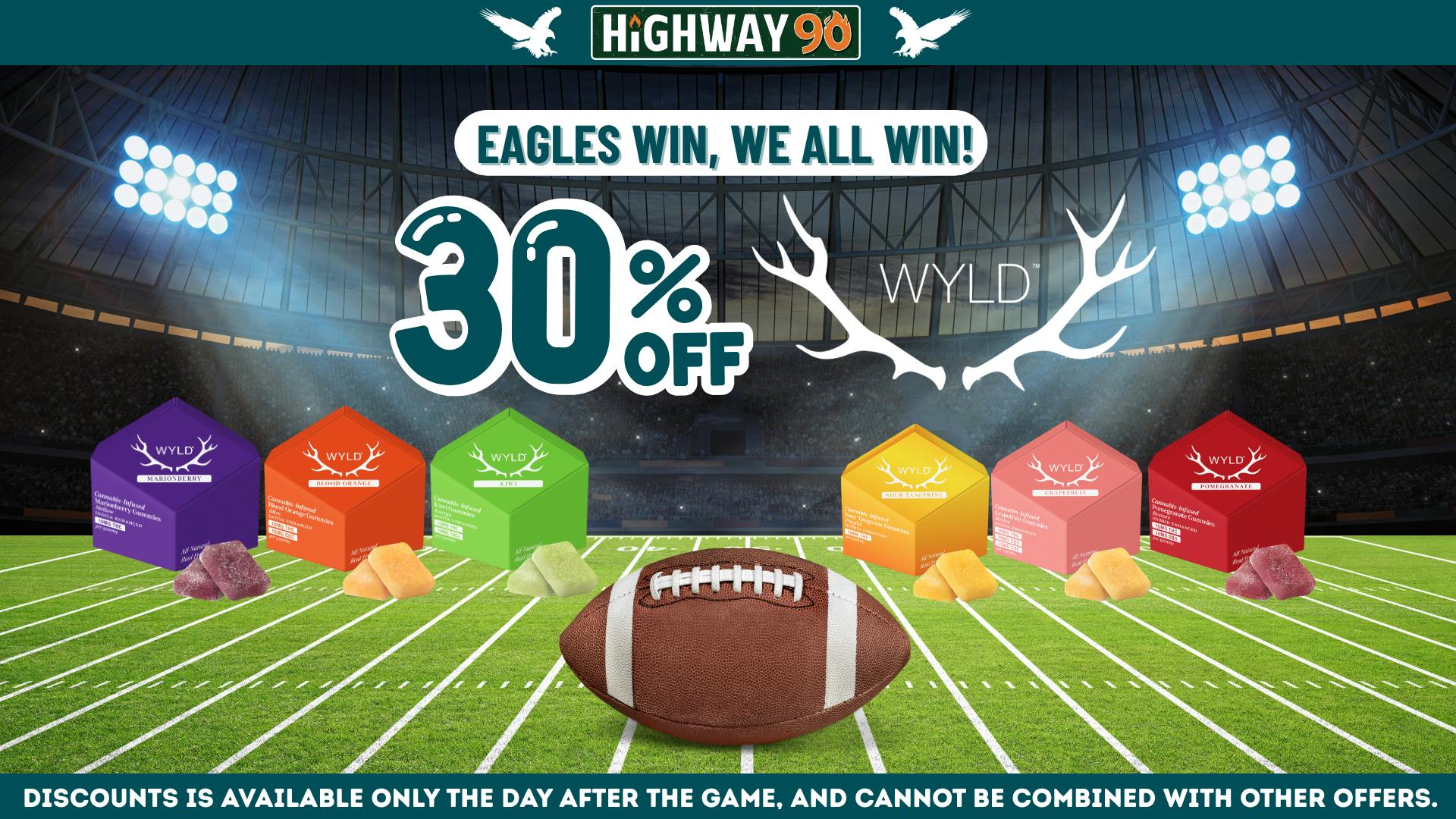 🛣️10/20 Deals:        🏈20% Off Storewide For The Eagles Win!🏈         ☀️30% Off The Clear & Twax☀️              💎30% Off Timeless & Noir💎      🍬30% Off Wyld🍬         🍃 2 for $50 or 3 for $75 Miss Grass 5pk Pre-Rolls 🍃        🌿25% Off Miss Grass 4.2g Flower🌿        🪄2 For $60 Miss Grass 1g Infused Pre-Rolls🪄         ⚡25% Off Rythm Edibles⚡          📲Download the Highway 90 App – Get 100 Bonus Loyalty Points!